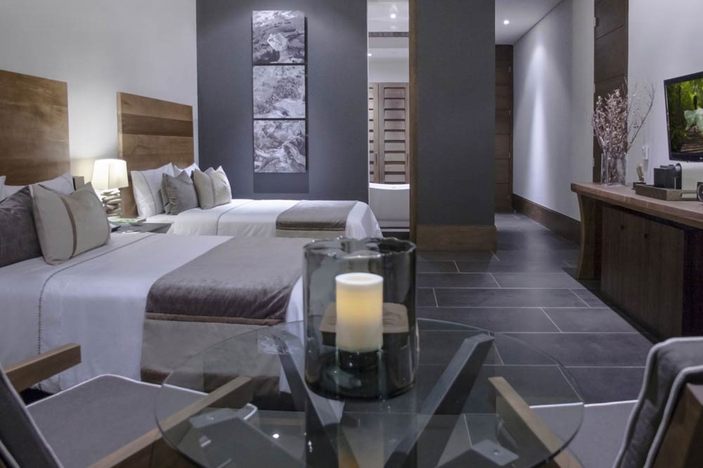 The Garden Suites Double at NIZUC Resort and Spa boasts floor-to-ceiling windows that open onto a beautiful terrace with a view of the mangroves. Suites are located in the ground level of the residence area.